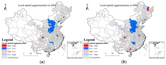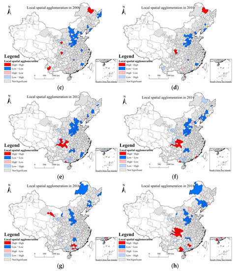 Results for local spatial agglomeration of AWUE. Note: Only the results of even years have been kept in this figure. (a) Local spatial agglomeration in 2004; (b) Local spatial agglomeration in 2006; (c) Local spatial agglomeration in 2008; (d) Local spatial agglomeration in 2010; (e) Local spatial agglomeration in 2012; (f) Local spatial agglomeration in 2014; (g) Local spatial agglomeration in 2016; (h) Local spatial agglomeration in 2018.