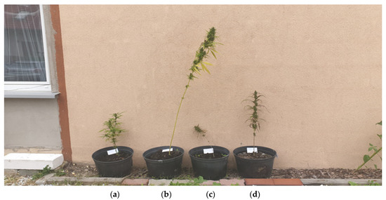 Female variety of Cannabis sativa L. Finola after 12 weeks of watering with LPGPC (a), LPGPN (b), LPGPA (c) and nontreated water (d).