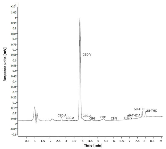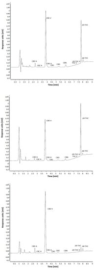 Chromatographic signals were identified by comparison with several CBDs and THC standards of analytical grade purchased from Lgcstandards Polska (Warsaw, Poland). Areas under particular chromatographic peaks were calculated involving OpenLAB CDS LC ChemStation computer software (Agilent, Santa Clara, CA, USA).