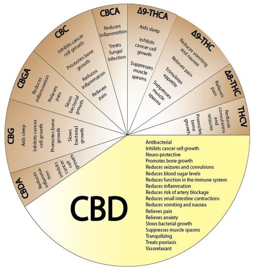 The individual impacts of each of the remaining 10 components, i.e., cannabidiolic acid (CBD A), cannabichromenic acid (CBC A), cannabigerolic acid (CBG A), cannabigerol (CBG), cannabidiol (CDB), cannabinol (CBN), tetrahydrocannabivarin (THC V), Δ9-tetrahydrocannabinolic acid (Δ9-THC A), Δ9-tetrahydrocannabinol (Δ9-THC) and Δ8-tetrahydrocannabinol (Δ8-THC) did not exceed 10%. The biological functions of those components and therapeutic applications were characterized in several sources [12,29,30] (see also Figure 3).
