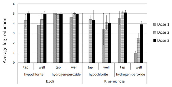 Efficacy of hypochlorite and hydrogen peroxide against E. coli and Pseudomonas aeruginosa in tap water and therapeutic well water, expressed as log removal rates. Tap: dechlorinated tap water; well: therapeutic water. Dose 1 = below breakpoint at hypochlorite/30 mg/L hydrogen peroxide, Dose 2 = 0.5 mg/L free chlorine/100 mg/L hydrogen peroxide, Dose 3 = 1 mg/L free chlorine/200 mg/L hydrogen peroxide.