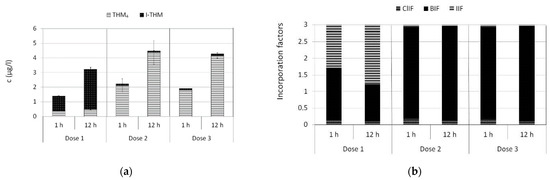 Chlorination byproducts of hypochlorite treatment in therapeutic water: (a) Concentration of total I-THM and THM4 compounds; (b) Incorporations factors for chlorine (ClIF), bromine (BIF), and iodine (IIF). Denotion of nominal concentrations: Dose 1 = below breakpoint, Dose 2 = 0.5 mg/L free chlorine, Dose 3 = 1 mg/L free chlorine.