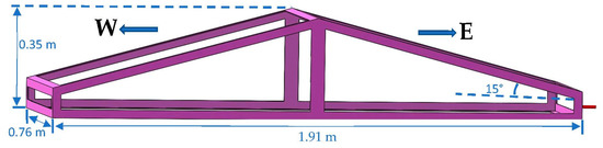 The solar still was fabricated using plain glass (4 mm thick), stainless steel (4 mm and 1 mm thick), silicone (A 555) glazing sealant, foam material and galvanized piping (12.7 mm and 6.35 mm in diameter). The main body of the solar still consisted of three parts: the glass cover support, basin and support structure. The glass cover support was made using 4 mm thick stainless steel. It measured 1.91 m long and 0.76 m wide. The overall height to the apex of the glass support was 0.35 m and the lowest sides measured 0.068 m. The inclination angle of the glass cover affects the performance of the solar still [,]. Different inclination angles ranging from 10° to 50° were employed in different studies [,,,,,,,,,,,,,,]. The optimum inclination angle results from two opposite effects of inclination angle variation. For large inclination angles, the volume of the cavity between the water surface and glass cover is large; thus, the air takes much longer to become saturated, delaying the start of productivity. Moreover, an increase of the inclination angle results in increased solar radiation losses by reflection from the glass cover when the sun altitude angle is high, such as around noon. From this point of view, the inclination angle should be closer to the latitude angle as much as possible. The only advantage that the large inclination angle offers is that, once condensation starts, the condensate on the inner side of the glass cover is drained faster into the collecting channel. Alternatively, for the case of very low inclination angles (less than 10°), although the cavity volume becomes less, the gravity-driven force is unable to overcome the surface tension and frictional forces between the small, condensed water droplets and the inner glass surface. Thus, the droplet could grow until its mass inertia overcomes the surface tension and drops into the basin. In consideration of the latitude angle of the test site (22.9° N) and the recommendation of an optimum angle of 15° by other studies [,,,,,], the roof of the structure was sloped at 15° to the horizontal, as shown in Figure 1. Each of the topside glass panes had an area of 0.652 m2 and that for each of the side panes was 0.123 m2.