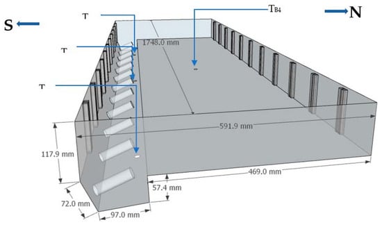 The operational parameters within the basin were measured using a set of thermocouples and a humidity–temperature transmitter. Two thermocouples (TG1 and TG2) were placed on the glass cover, one on the east cover and the other on the west cover, while four thermocouples (TB1, TB2, TB3 and TB4) were installed in the basin of the solar still to measure the temperature of the inner glass surface and basin water temperatures, respectively. The location of the thermocouples installed in the basin is shown in Figure 2. The humidity and vapor temperature were measured using a Dwyer humidity–temperature transmitter with a humidity range of 0–100% and a rated temperature range of 0–100 °C. The data acquisition was performed using the LabVIEW program along with three Modbus and DCON data acquisition modules. The measurement of the global radiation was performed using a pyranometer (Model PSP of Eppley Laboratory, Inc., Newport, RI, USA).