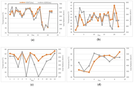 Variation in average basin water temperature (ABWT) with average daily solar radiation (ADSR): (a) conventional solar still (unmodified); (b) conventional solar still (modified); (c) active solar still (unmodified); and (d) active solar still (modified).