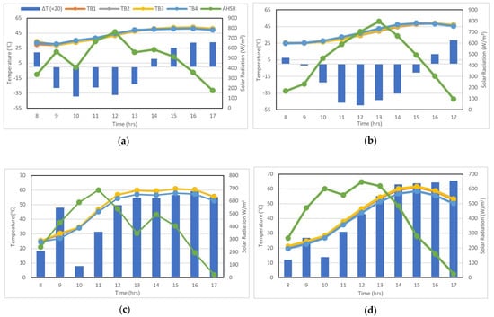 Figure 5 illustrates the hourly variation in the temperature within the basin of the solar stills on the first day of testing for each configuration. The first day was selected because the solar stills contained approximately the same volume of water; therefore, the effect of volume on the heat transfer within the basin can be ignored. ∆T represents the temperature difference between the temperature measurements at the TB2 and TB4 positions (see Figure 2), i.e., TB2–TB4. This temperature difference is used to measure the effectiveness of the fins in transferring heat through the brine. In addition, ∆T is scaled up by a factor of 20 so that the variation can be distinctively seen on the graphs. The water in the trough of the basin has relatively uniform heating as TB1, TB2 and TB3 are approximately the same, as shown by the overlapping lines. The temperature of the section of water above the absorber plate (TB4), however, differs slightly from that in the trough due to the design of the trough and the low thermal conductivity of water. Figure 5a,b both show that the temperature of the water above the absorber plate remains higher than the portion of water in the trough during the morning. Additionally, Figure 5a shows that the portion of water above the absorber plate begins to lose heat sooner than that shown in Figure 5b as ∆T changes sign sooner. This implies that the heat dissipates from the basin water more readily without the presence of fins. Therefore, the fins effectively help maintain the temperature of the section of water above the absorber plate. Figure 5c,d demonstrate that the temperature of the basin water is less sensitive to changes in the amount of solar irradiation received when the solar water heater was integrated with the system.