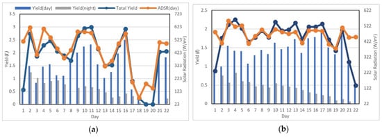 where  represents the time interval in s, I(t) represents the solar radiation intensity in W/m2 and  represents the condensation rate (production rate) in kg/s. This concept was adopted and used to calculate the values shown in Table 3. The daily productivity (production rate), , was determined practically as []: