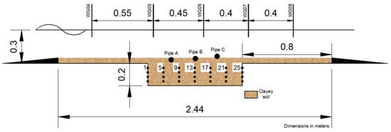 At the bottom of the flume, there is a removable section (13 m from the wave maker), that was replaced for these tests by an acrylic pit, 0.84 m long, 0.285 m wide, and 0.2 m deep (see Figure 1). The area of clayey soil was 2.44 m in length, including the pit and the space before and after it, between the two ramps (black triangles in Figure 1). Outside the pit, the clayey soil had a thickness of 0.05 m. The water depth outside the experimental area was 0.3 m, while in the experimental area it was h = 0.25 m.