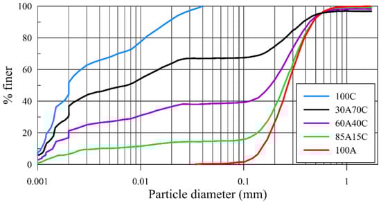 The soil used in the tests was made “in-house”, using a mixture of commercial kaolinite and sand, brought from the coast of Puerto Morelos, Mexico (D50 of 0.267 mm). Commercial kaolin has been successfully tested previously [21,22]. Five different types of soil were tested preliminarily, ranging from all sand, identified as 100A, to all mud, identified as 100C. Between these extremes, three combinations of sand (A) and mud (C) were tested: 85% sand—15% kaolinite (85A15C); 60% sand—40% kaolinite (60A40C); and 30% sand—70% kaolinite (30A70C). The physical and mechanical properties of the soil, measured in the laboratory, are shown in Table 1, where emax and emin are the maximum and minimum void ratios (determined in the laboratory), ρs is the soil mass density, ρw is the water mass density and D50 is the value of the particle diameter at 50% in the cumulative distribution.