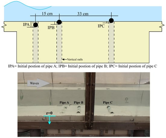 Each group of tests differed in the initial burial depth of the three pipes in the clayey soil, and in the submerged specific weights (see Table 2). The position of the pipes, z, is the distance from the pipe to the soil surface, i.e., zero would correspond to a pipe resting on the bed and 3.0 cm to a totally buried pipe. In Table 2, the initial positions are shown relative to the pipe diameter. The pipes were referred to as Pipe A, closest to the wave-maker, 92 cm away from the beginning of the clayey soil area, Pipe B, placed 15 cm from Pipe A, and Pipe C, located 33 cm further away. These distances were set to ensure their visibility in the tests (see Figure 3). The direction of the wave propagation was from Pipe A towards Pipe C. The PVC pipes were placed inside plastic rails to allow only vertical displacement (see Figure 3). The rails were slightly wider than the pipe diameter to minimize friction effects during the displacement of the pipes. Given that the pipes were placed on the soil, and in some cases buried, the hydrodynamic alteration due to the pipes themselves, or the recording equipment, is negligible. The same pipes were used in all the tests, thus the interaction between the soil and the pipe roughness is a constant and its analysis falls beyond the scope of this research.