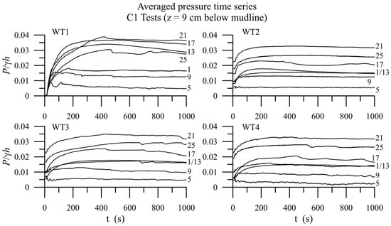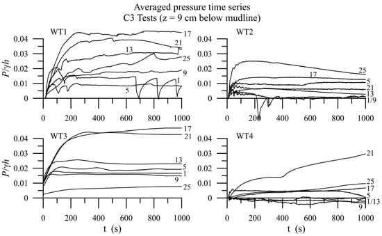 Given that the critical data recorded during the experiments is the pore pressure within the soil, Figure 4 shows an example of the time series of period averaged pressures recorded. The plots correspond to C1 tests. It can be seen that pore-water pressure exceeding the static pore-water pressure, p, is dimensionless by the product of the specific weight of water, γ and the water depth, h. Figure 4 shows the time series corresponding to the upper line of pressure transmitters, namely sensors 1, 5, 9, 13, 17, 21 and 25 (see Figure 1). These sensors were placed closest to the mudline, 9 cm below the soil-water interface, and thus show the highest excess pressures.