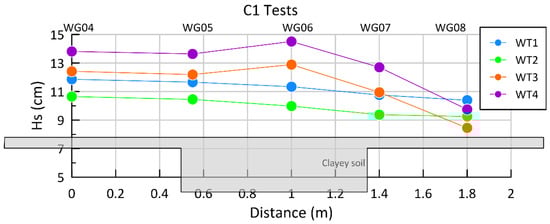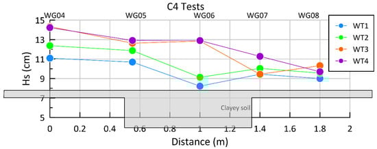 Significant wave height distribution along the clayey soil in C4 tests. The shaded area (clayey soil) is shown for reference.