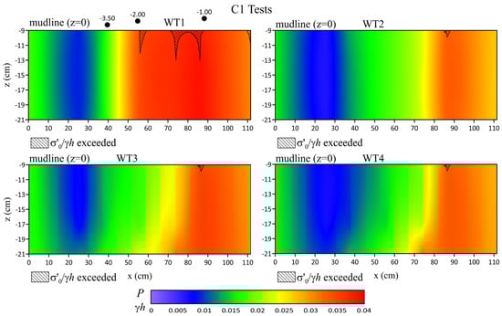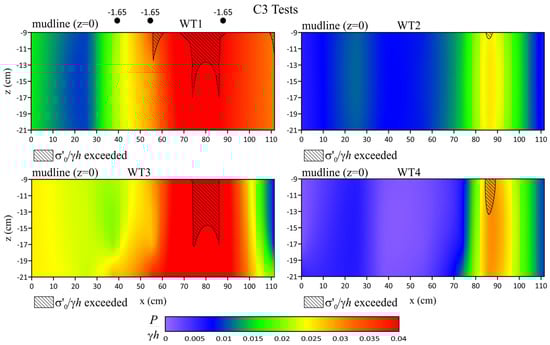 In order to analyze the maximum pore pressures recorded during the experiments, and to relate this with the areas of theoretical soil failure, pressure maps were plotted showing the instant of maximum pressure for each wave condition, shown in Figure 6. For the instant of maximum pressure measured by each transmitter, a linear interpolation was performed, obtaining a pressure map for the whole area. Then, the initial mean normal effective stress was estimated, using equation 1 [26] for the whole soil area, and the zones where this value was exceeded were added to the maximum pressure map. In Equation (1), is the initial mean normal effective stress, γ’ is the submerged specific weight of the soil, k0 is the coefficient of lateral earth pressure, as given by [20] and is equal to 0.441; z is the vertical coordinate measured downwards from the upper surface of the soil to the bottom of the flume.
