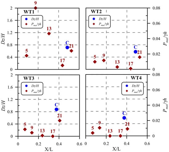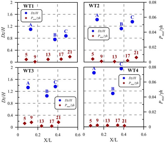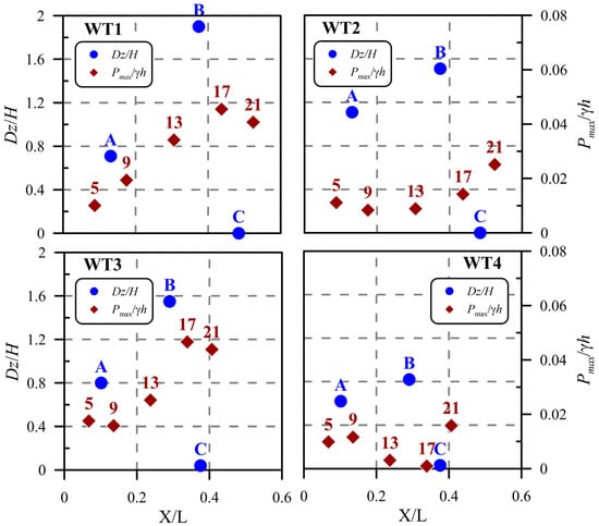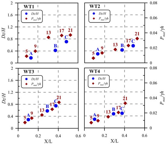 To analyze the relationship between the spatial evolution of the wave height and the vertical displacement of the pipes, Figure 7 shows the vertical displacement for each WT. The sinking distances, Dz = final position − initial position, of pipes A, B and C were plotted, as well as the maximum pressures recorded by the transmitters located closest to the clay-water interface.