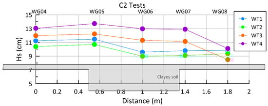 Significant wave height distribution along the clayey soil in C2 tests. The shaded area (clayey soil) is shown for reference.