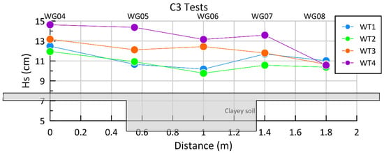 Significant wave height distribution along the clayey soil in C3 tests. The shaded area (clayey soil) is shown for reference.