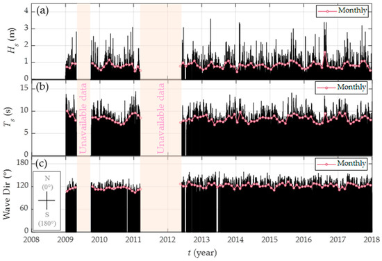 Figure 2. Time series wave data (2009–2017) measured at the Sendai Shiogama Station (NOWPHAS). (a) Significant wave height (Hs). (b) Wave period (Ts). (c) Wave direction.