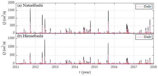 Figure 3. Hourly river discharge (2011–2017). (a) Natoribashi Station, (b) Hirose Station.