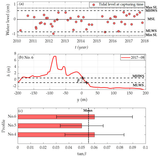 The wet–dry line or the high-water line (HWL) dividing the dark (wet) and light (dry) sand on the beach is defined as the shoreline position using the unsupervised K-means clustering algorithm. A detailed description and some applications of this cluster analysis are referred to in [20,34]. For a small number of images where the features of wave breaking bubbles are neutralized on the shore, a manual shoreline detection based on the edge gradient and direction between sand and water was implemented on each image to detect the shoreline. Different water levels at the time of capture caused by tides can affect the consistency of the shorelines. A conventional tidal correction was applied to each shoreline by translating the detected line onshore and offshore a certain distance determined by the estimated tidal level data at Sendai Shinko Station (Figure 1) and the beach slope (tanβ). The representative beach slope during the recovery process was averaged from the beach slopes of the beach profiles in front of the sandy beach (Figure 1) within the intertidal range from mean low water springs (MLWS) to mean high water springs (MHWS) (Figure 4b,c). Details about the beach profiles are mentioned in the next section. In addition, the overall accuracy of the detected shorelines can be affected by a degree of uncertainty derived from the geo-referencing and shoreline detection. Considering all potential errors, a possible uncertainty of 1.5 m was obtained for the detected shorelines. To support the later estimate and discussions, a new reference system with a baseline rotated counterclockwise 202 degrees to the north was designated to reference all images and detected shorelines.