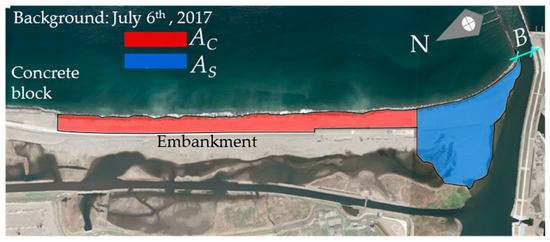 From the shorelines, the morphological change can be investigated by the important features of the river mouths, which are the areas of the sand spit, AS (m2) and sandy beach, AC (m2); the width of the river mouth, B (m). The areas of the sand spit and sandy beach are separated by a defined position where the river flow is assumed to not reach the sandy beach area. The width of the river mouth is the smallest throat channel defined by both sides of river mouth. The clear definitions are shown in Figure 5.