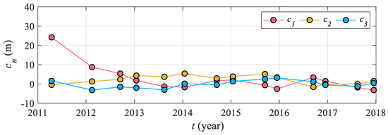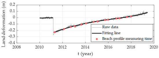 The data utilized for EOF analysis was the survey of beach profiles along the sandy beach in front of Idoura Lagoon provided by the Sendai Office of River and National Highway Ministry of Land, Infrastructure, Transport, and Tourism (MLIT). Three beach profiles at a spacing of about 0.5 km were measured from 2011 to 2017 using an echosounder and integrated DGPS. The precision of the GPS was ±2 m and that of the echosounder was about 0.2 m. Figure 1 shows the location of the measured profiles and the detailed measuring frequency is shown in Figure 6a. Figure 6b presents the measured profile data at each location. The measured daily land elevation data at a GNSS Crustal deformation station nearest to the mouth area (Figure 1) collected from the Geospatial Information Authority of Japan (GSI) suggests that there is a possible seismic land subsidence of 0.22 m induced by liquefaction triggered by the earthquake motion (Figure 7). The post-seismic deformation data show the quick recovery of the ground level with the linearly rising rate. According to Tinh et al. [38], the bed recovery of the Sendai Plain after the tsunami was detected at all GNSS Crustal deformation observations with almost the same land rising rate of 3.3–3.8 cm/year. The land rising levels at the measuring times are not much bigger than the possible uncertainty caused by the measuring device. In addition, the closer view of the profiles at the deep-water area shows insignificant change. Therefore, the removal of bed level rising on the dataset can be neglected in this study.