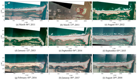 The aerial photographs in this study were taken by aircraft at the highest frequency of once a month. The spatial interval of a single capture can cover the longshore distance from 0.5 to 1 km. Some images from the Geospatial Information Authority of Japan (GSI) were also retrieved. The resolution of the images is sufficiently high (0.5–1 m) and the detailed information on the retrieved images can be found in Figure 4a. All images were transformed into orthoimages and geo-referenced by selecting a series of ground control points (GCP) from Google Earth Pro software and assigning them to a spatial reference system, WGS84/UTM Zone 54S. Projective matrix and bilinear interpolation were applied as image transformation and resampling methods.