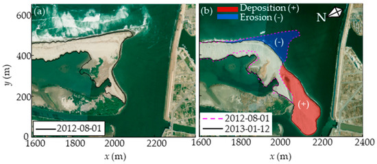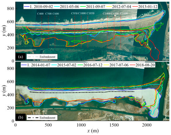 Figure 9. Shoreline position change. (a) Early stage of the recovery until the intrusion of the sand spit. (b) After the intrusion of the sand spit until the completion of the newly constructed embankment.