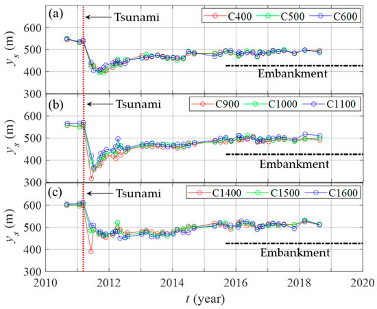 As seen in Figure 9, the shorelines of the sandy beach were pushed onshore after the tsunami. Three different zones along the coast, defined in Figure 9a, were selected to show the temporal variation of the shoreline positions (Figure 10). Shoreline change near the concrete block is indicated by C400, C500, C600 in Figure 10a, while the shoreline changes at the middle area of the sandy beach and near the sand spit’s area are shown in Figure 10b (C900, C1000, C1100) and Figure 10c (C1400, C1500, C1600), respectively.