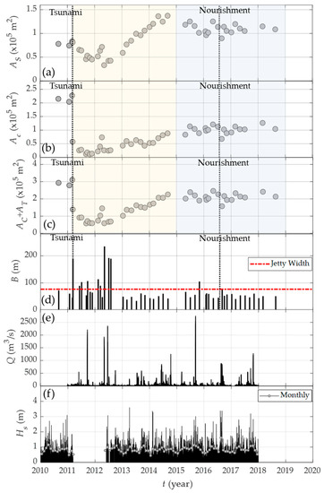 Figure 11. (a) Area of sand spit, AS. (b) Area of sandy beach, AC. (c) Total area, AC + AS. (d) Width of the river mouth, B. (e) Hourly river discharge (Hirosebashi and Natoribashi combined), Q. (f) Significant wave height, Hs.