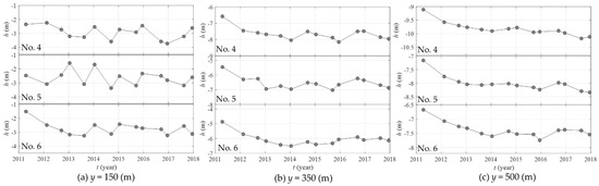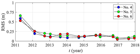 The variation from the depth y = 350 m is very small and almost negligible during the latter half of the observation data. Hence, the root mean square (RMS) values based on Equation (3) demonstrates that the depth change was only significant after the tsunami and gradually reduced to zero from 2014 (Figure 16). The RMS values after 2014 were negligible, since they are smaller than the profile measuring accuracy.