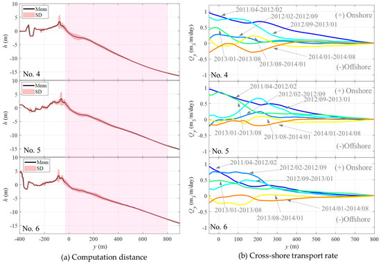 Figure 14. Cross-shore sediment transport. (a) Computation distance: black line is the mean profile of all data at each location, SD is the standard deviation of profile data, the shaded region is the selected computation distance. (b) Cross-shore transport rate, Qy.