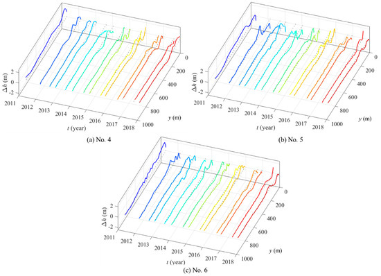 where Δh is the elevation change (m) and h ¯ e ( y ) is the average of the last 4 profiles (m). The profile changes obtained from Equation (2) is shown in Figure 15.