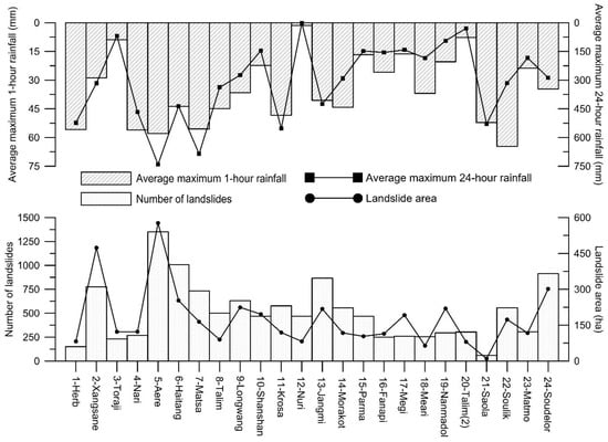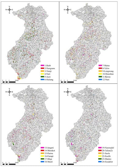 After collecting 24 sets of satellite images of the Shihmen watershed during the period from 1996 to 2015, landslide inventories triggered by 24 typhoon events were mapped according to the interpretation procedures proposed by Liu et al. [53]. The landslides recorded in the 24 landslide inventories in each slope unit are shown in Figure 2. The number of landslides for each landslide inventory ranged from 59 to 1350 and the total landslide area ranged from 10.19 ha to 577.04 ha (Figure 3).