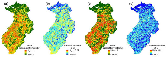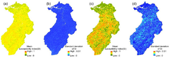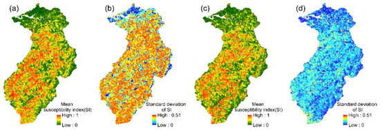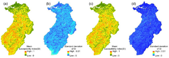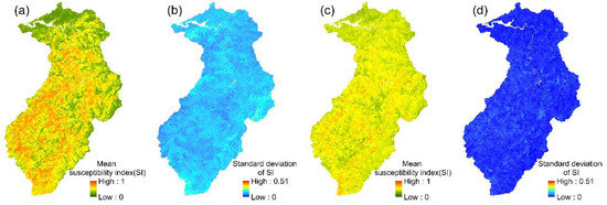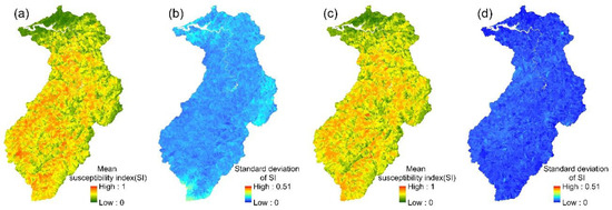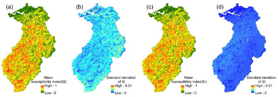 LR models: (a,b) the mean susceptibility index and standard deviation of 24 event-based models; (c,d) the mean susceptibility index and standard deviation of the multi-year model.