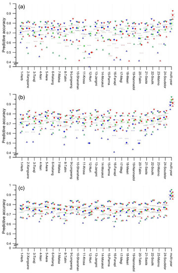 The hyperparameter tuning results for each event-based model established using the KLR algorithm are shown in Table 7; it can be seen that the penalty parameter (C) ranged from 0.017 to 244.205 and the RBF parameter (γ) ranged from 0.002 to 0.281. The test accuracy of every event-based model ranged from 0.712 to 0.833 and the mean was 0.754. Hyperparameter tuning for the multi-year KLR model yielded a penalty parameter (C) of 1.0 and an RBF parameter (γ) of 0.1; the model’s test accuracy was 0.812.