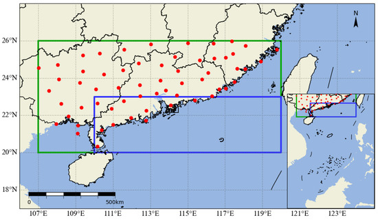 Schematic diagram of the South China (the green box represents the area where the precipitation is studied, the blue box is the judgment area of South China Sea summer monsoon onset, and the red spot is the meteorology stations).