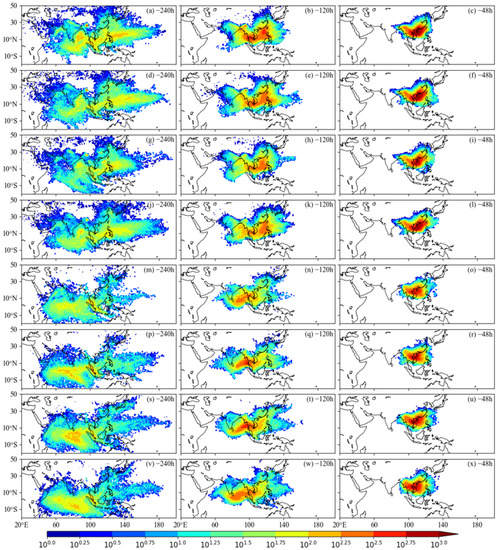 Distribution of cumulative specific humidity of each 1° × 1°grid on the water vapor transport trajectories in the preflood season (1960–2012) 10 days, 5 days, 2 days before the water vapor reaches South China.((a–l) for the frontal precipitation, (m–x) for the monsoon precipitation; (a–f,m–r) for PDO positive phase, (g–l,s–x) for PDO negative phase; (a–c,g–i,m–o,s–u) for IOD positive phase, (d–f,j–l,p–r,v–x) for IOD negative phase, unit: g/kg/grid).