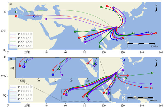 Clustering path of water vapor transport trajectories of precipitation for positive/negative phase of IOD in the preflood season over SC with the synergy of PDO (1960–2012) ((a) the frontal precipitation, (b) the monsoon precipitation, blue line: clustering trajectories for PDO positive phase and IOD positive phase, red line: clustering trajectories for PDO positive phase and IOD negative phase, green line: clustering trajectories for PDO negative phase and IOD positive phase, purple line: clustering trajectories for PDO negative phase and IOD positive phase, the number at the start of the trace is the trace number).