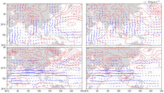 Difference of 850 hPa geopotential height field (red contours, unit: gpm), integrated water vapor flux (blue vector, unit: kg·m·s−1) between four PDO&IOD phase combinations in the preflood season over South China during 1960–2012 ((a,b) for the frontal precipitation, (c,d) for the monsoon precipitation; (a,c) for PDO positive phase &IOD positive phase minus PDO positive phase &IOD negative phase, (b,d) for PDO negative phase &IOD positive phase minus PDO negative phase &IOD negative phase).