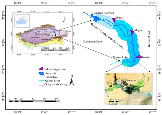 The “green corridor” at the lower reaches of the Tarim River is located in the eastern part of the Tarim Basin in Xinjiang, China, between the Taklimakan and Kuruk deserts. Topographically, this region is high in the north and low in the south and high in the west and low in the east, with a curved channel. The elevation ranges between 801.50 and 846.25 m above sea level, with the Taitema Lake region as the lowest point (801.50 m).The lake is situated at the lower reaches of the Tarim River. As a terminal lake of the inland Tarim River in an arid region, Taitema Lake is of great significance for maintaining the stability of the regional ecosystem, conserving soil and water, preventing desertification, and protecting the safety of oases [].