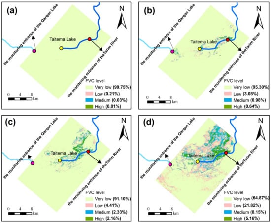 Spatial distributions of the fractional vegetation cover of the Taitema lake region in 2001 (a), 2007 (b), 2014 (c), and 2018 (d).