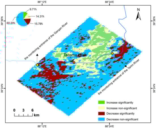The linear trend of FVC dynamics in the study region was calculated based on Formula (5). Figure 5 displays the spatial trend of FVC dynamics in the Taitema Lake region in 2000–2018. It was found that FVC increase was observed in 24.02% of the study region, with a significant increase (p < 0.05) in 9.71% and a non-significant increase in 14.31% of the study region. The increases were mainly concentrated in the northeast of Taitema Lake, namely around the lake entrance channel of the Tarim River. This is because with the implementation of EWCP in the lower reaches of the Tarim River, there are sufficient water sources providing favorable conditions for vegetation growth, enabling a gradual rise in the FVC in the region. A decline in FVC, however, was found in 75.98% of the study region, with 15.78% having a significant decline (p < 0.05) and 60.20% having a non-significant decline. After the implementation of EWCP, the water area was raised to 463.79 km2 in 2018 from 49 km2 prior to the implementation of the water conveyance.