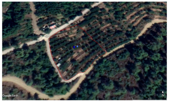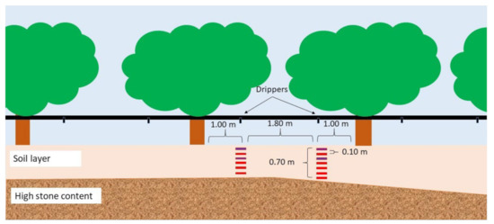 The terraced field is cultivated with nectarine trees (Prunus Persica var. nucipersica, cultivar “Fairlane”) and covers an area of approximately 2500 m2. There is one tree row per terrace, with an approximate planting distance of 4 m. The total number of trees in the field is 122. Each tree is irrigated by two drippers, located approximately 1 m west and east from the tree trunks. The maximum rooting depth observed from two 90 cm soil core samples was 80 cm. The geology of the substrate is diabase and gabbroic diabase [31]. The soil texture from 0 to 15 cm depth is classified as sandy loam–loam, from 15 to 30 cm depth as loam, and from 30 to 60 cm depth as clay loam.