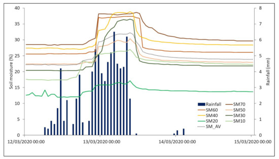 Hourly rainfall, average volumetric soil moisture of the root zone (SM_AV) and average soil moisture for 70 cm (SM70), 60 cm (SM60), 50 cm (SM50), 40 cm (SM40), 30 cm (SM30), 20 cm (SM20), 10 cm (SM10) soil depths.