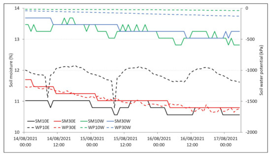 Hourly soil moisture (SM) and soil water potential (WP) at the east (E) and west (W) profile, at 30 cm (30) and 10 cm (10) depths.