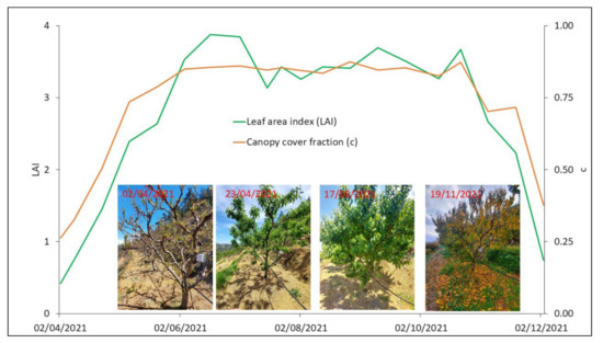 Changes in leaf area index (LAI) and canopy cover fraction (c) of the Nectarine trees for the period 2 April 2021–3 December 2021. The photos show the changes in the foliage of the nectarine trees over time.