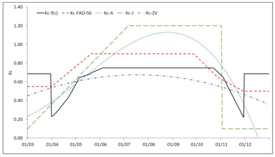 Daily crop coefficients for Prunus persica computed as a function of the LAI (Kc f(c)) (current study), from the FAO-56 table (Kc-FAO-56) and as a function of time according to [25] (Kc-A), [27] (Kc-J) and [28] (Kc-ZV).