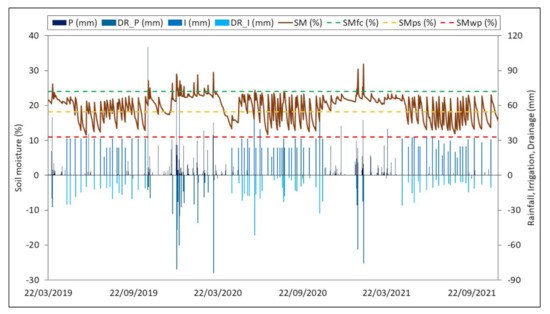 Daily soil moisture at the root zone (SM), rainfall (P), irrigation (I) and drainage losses during the rainfed (DR_P) and irrigation (DR_I) periods. The green, yellow, and red dotted lines indicate the soil moisture at field capacity (SMfc), water stress (SMps), and wilting point (SMwp), respectively.