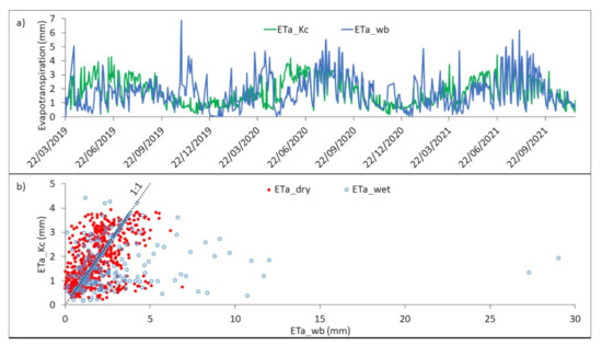 Daily evapotranspiration estimated with the Kc approach (ETa_Kc) and daily evapotranspiration estimated from the water balance (ETa_wb), for the period between 22 March 2019 and 18 November 2021 (a) and ETa_wb vs. ETa_Kc on wet (P > 0, I > 0) and dry days (b).