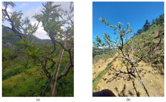Galata nectarine field on 10 April 2020 (a) and on 9 April 2021 (b).